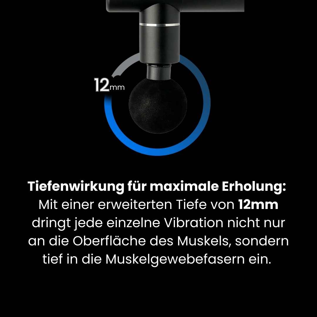 Mit einer Eindringtiefe von 12mm wirkt jede Vibration nicht nur oberflächlich, sondern erreicht tiefere Muskelschichten. Dies sorgt für eine effektive Lösung von Verspannungen und hilft dabei, stressbedingte Schmerzen, insbesondere im Rücken- und Nackenbereich, nachhaltig zu lindern.