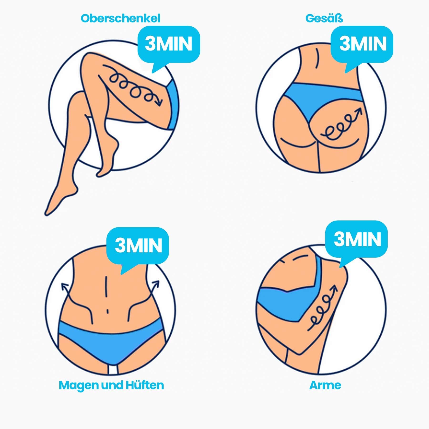 Die Anwendung ist besonders einfach: Führe langsame, gleichmäßige Bewegungen über die gewünschte Körperpartie – ideal für Po, Beine, Arme, Taille und Bauch. Genieße dabei deine tägliche Beautyroutine ganz entspannt von zu Hause aus.